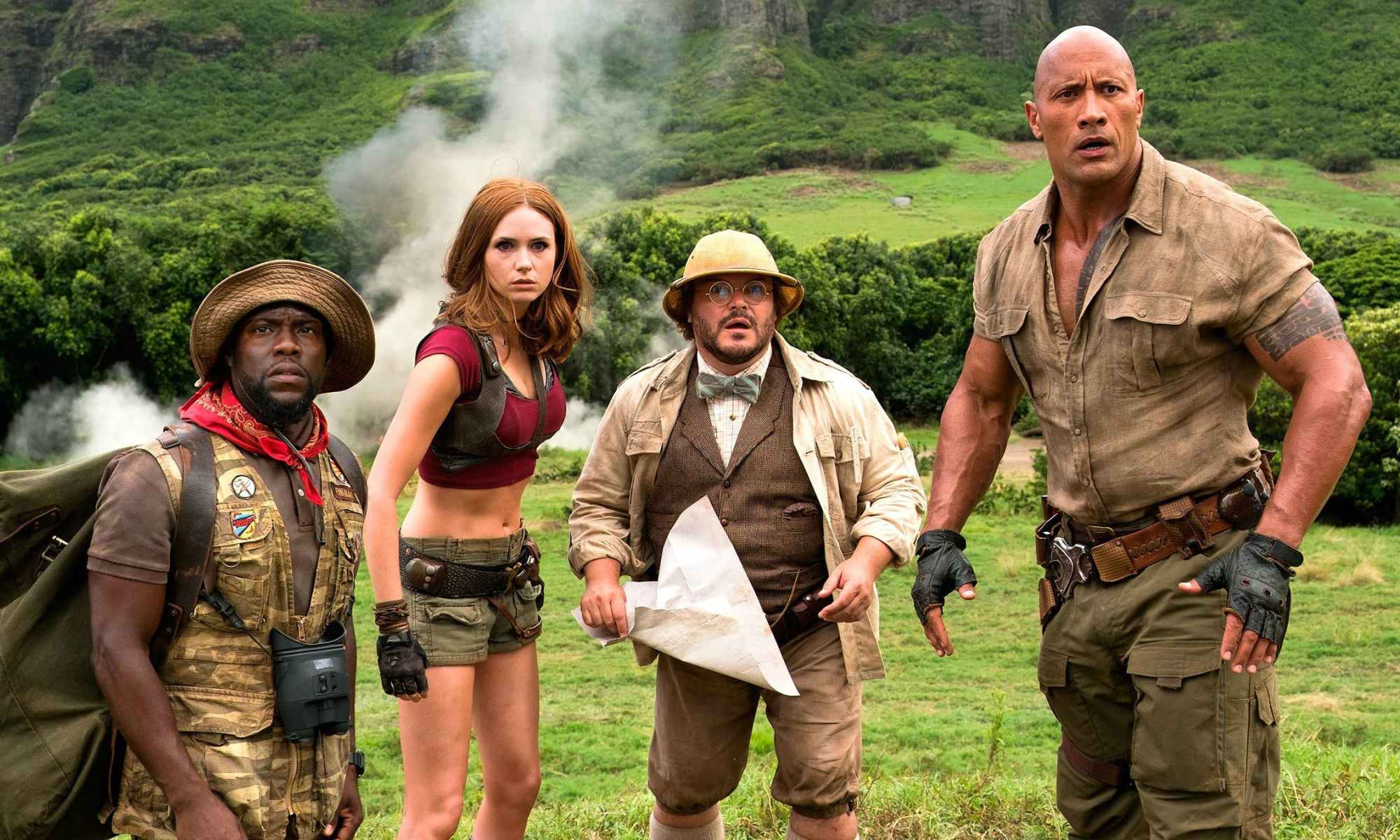 Four students at Brantford high, once considered the most unlikely of associates thanks to their own interests, are forced into detention together by their own youthful foolishness and self-assurance. Calling the resulting evening a dull one, however, would be quite wrong, as gamer Spencer (Alex Wolff), preppy Bethany (Morgan Turner), jock “Fridge” (Ser’Darius Blain) and popular girl Bethany (Madison Iseman) succumb to their curiosity and boot up an old video game, titled “Jumanji” after the board game with which it was packaged. Once the game turns on and their characters are chosen, the four are whisked away to the jungle world of the game and given the forms of their respective avatars: a physically towering explorer (Dwayne Johnson), an attractive martial artist (Karen Gillan), a meek, yet resourceful zoologist (Kevin Hart), and a brilliant, albeit obese cartographer (Jack Black). Fighting the elements of the wild, vicious treasure hunters in search of a cursed gem, and the antithetical talents given to them by the characters they chose, the four must either set their differences aside and beat the game to return home, or disappear forever at the drop of their last lives.